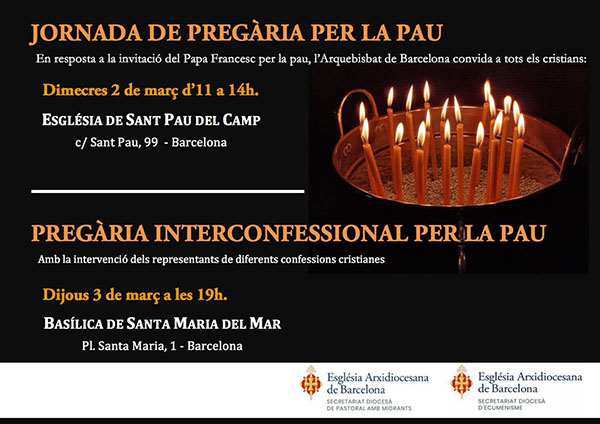 També, interconfessionalment hi haurà una pregària per la pau. En ella hi haurà la intervenció dels representants de les diferents confessions cristianes. Serà el dimecres 3 de març a les 19h a la Basílica de Santa Maria del Mar.
