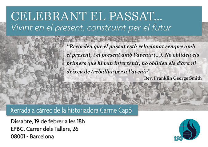 El dissabte 19 de febrer, a les 18h, en el marc de les celebracions del nostre aniversari, tindrem en el nostre temple una xerrada històrica, a càrrec de Carme Capó, sobre la nostra comunitat i els seus 150 anys d’història.